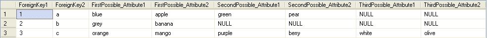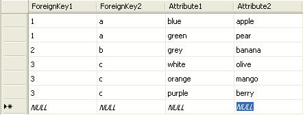 This is a bit different from a PIVOT which can be done using the SQL Server function of the same name. What we wanted to get is for each combintation of ForeignKey1 and ForeignKey2, we would like to have all the possible combinations of Attribute1 and Attribute2 in the same row.